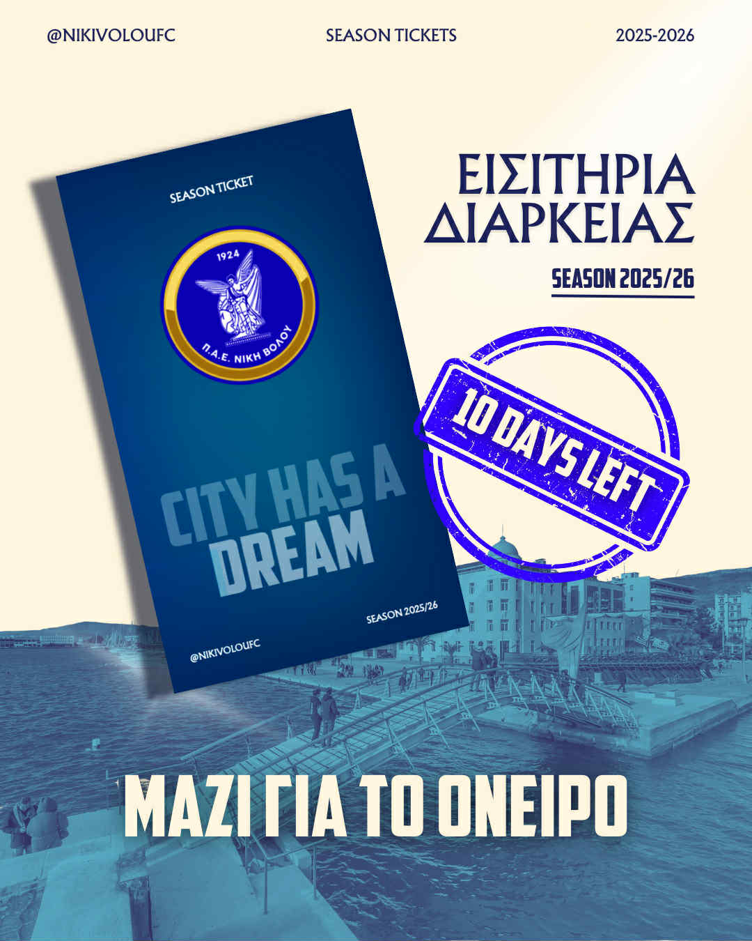 Η ΠΑΕ Νίκη Βόλου ενημερώνει τους φιλάθλους της πως απομένουν μόλις δέκα ημέρες για την αίτηση αγοράς των εισιτηρίων διαρκείας τους, για την αγωνιστική σεζόν 2025-2026, με την διαδικασία να ολοκληρώνεται το βράδυ της Παρασκευής 3 Οκτωβρίου.