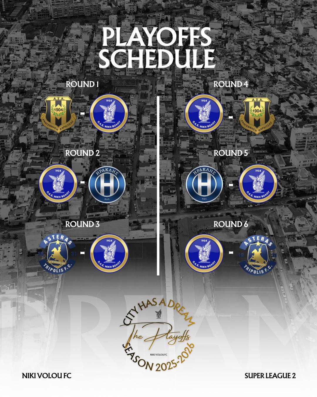 Στα γραφεία της διοργανώτριας αρχής (Super League 2) πραγματοποιήθηκε σήμερα Δευτέρα 2/2/2026, η κλήρωση των playoffs ανόδου στα οποία συμμετέχει και η ομάδα μας. Αναλυτικά το πρόγραμμα των playoffs: Σάββατο 14/2 1η Αγωνιστική Αναγέννηση Καρδίτσας-Νίκη Βόλου Ηρακλής-Αστέρας Κυριακή 22/2 2η Αγωνιστική Νίκη Βόλου-Ηρακλής Αστέρας Β’-Αναγέννηση Καρδίτσας Σάββατο 28/2 3η Αστέρας Β’-Νίκη Βόλου Αναγέννηση Καρδίτσας-Ηρακλής Κυριακή ...